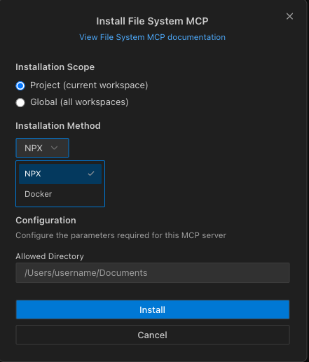 Some MCPs require specific information during installation, such as API keys or URLs. When installing these "parameterized" MCPs, you'll be prompted to: