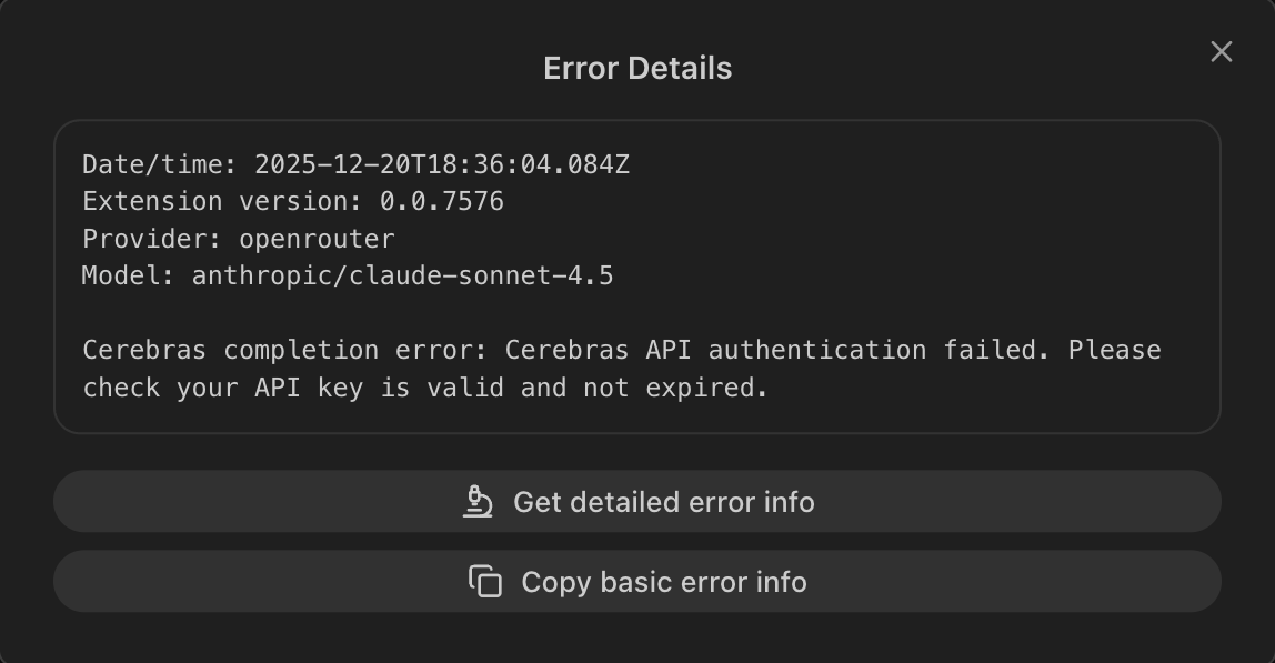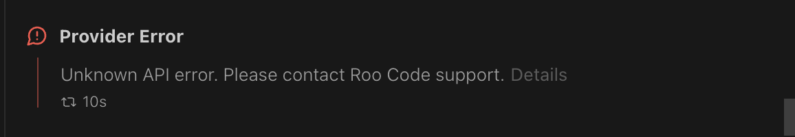 When Roo Code encounters an error, you can export detailed diagnostic information to share with the support team. This helps resolve issues faster by providing complete context about what went wrong.